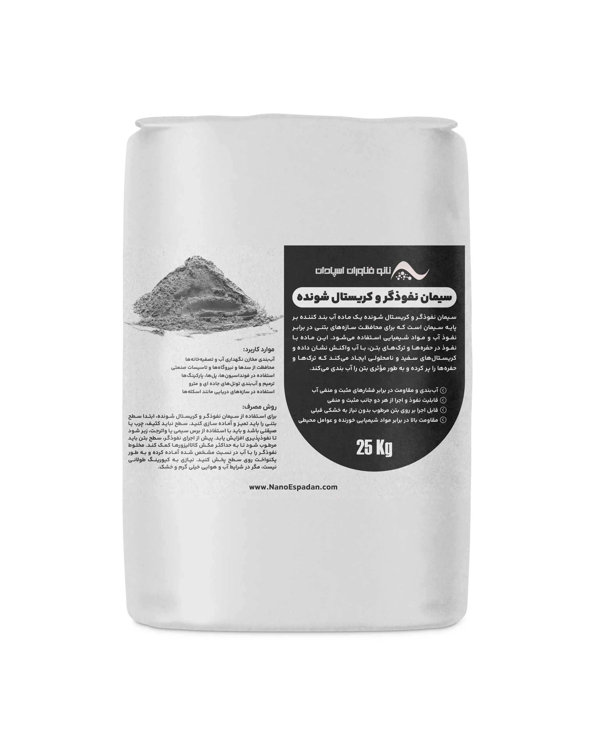 سیمان نفوذگر کریستال شونده نانو در بستهبندیهای 25 کیلویی عرضه میشود.