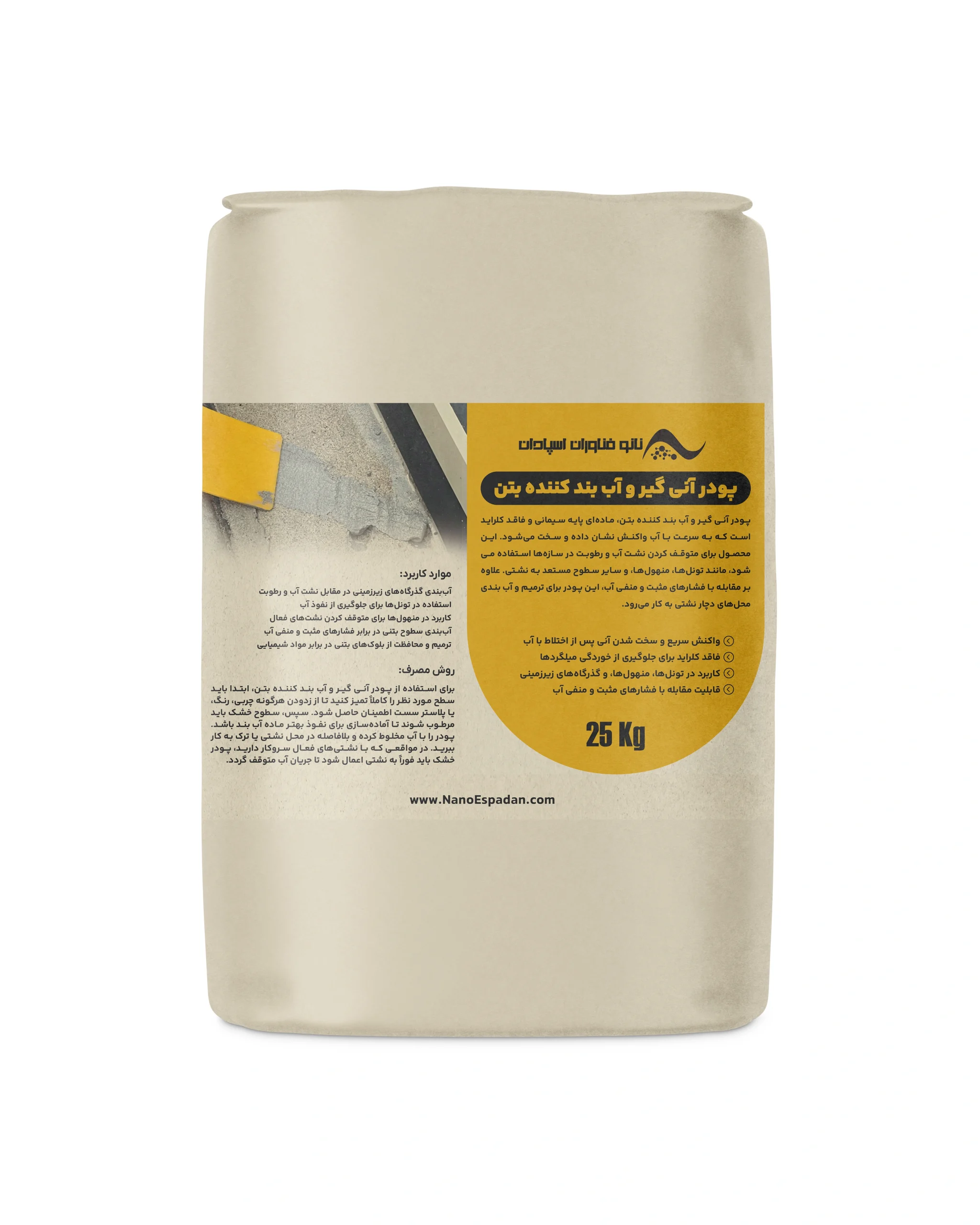 سیمان آب بند کننده نانو در بستهبندیهای 25 کیلویی عرضه میشود.